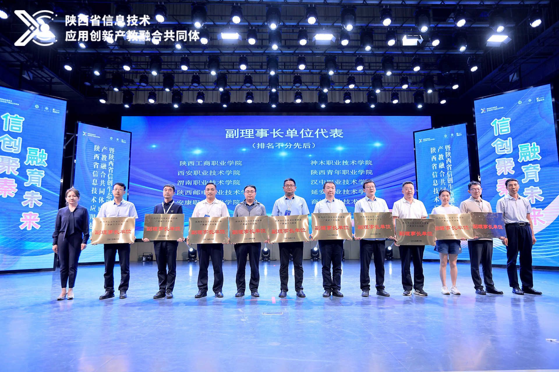 大会选举产生了第一届理事会领导机构,聘请了第一届共同体专家。相关领导为特聘专家颁发聘书,为理事长单位、副理事长单位、常务理事单位代表授牌,为陕西省信息技术应用创新产教融合共同体、信息技术应用创新产教融合实践中心揭牌。