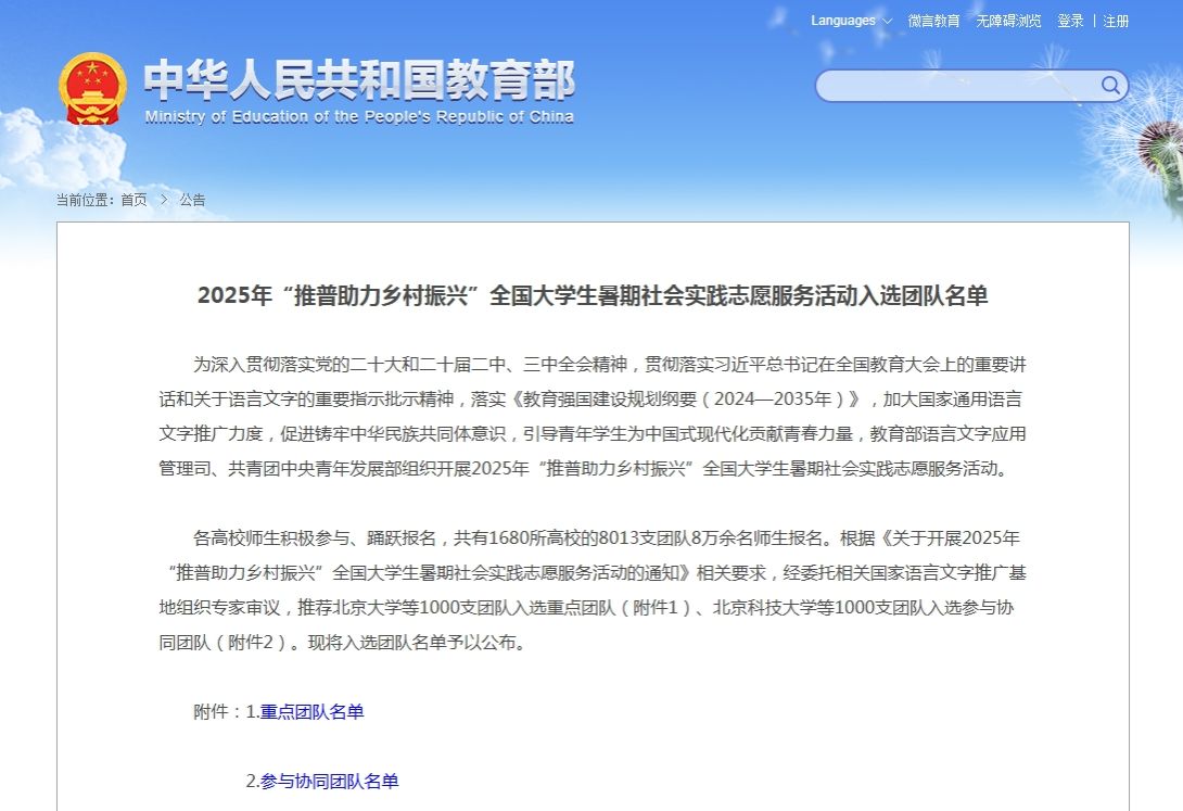 7月4日,教育部公布2025年“推普助力乡村振兴”全国大学生暑期社会实践志愿服务活动入选团队名单,beat365英国官方网站小学教育学院王禹心、程琪虹老师指导的“‘青苗普语 推普筑梦’乡村振兴先锋队”成功入选。