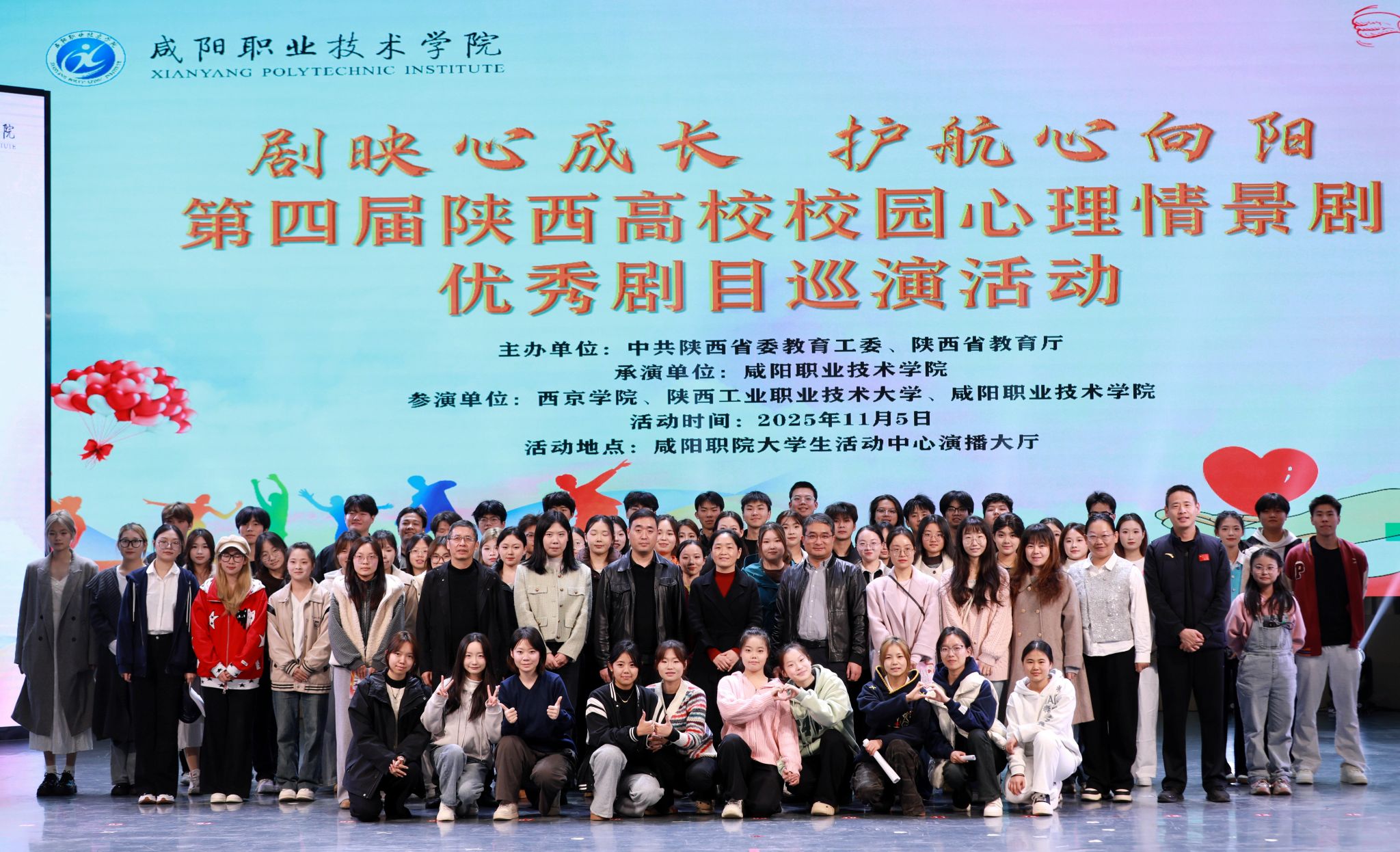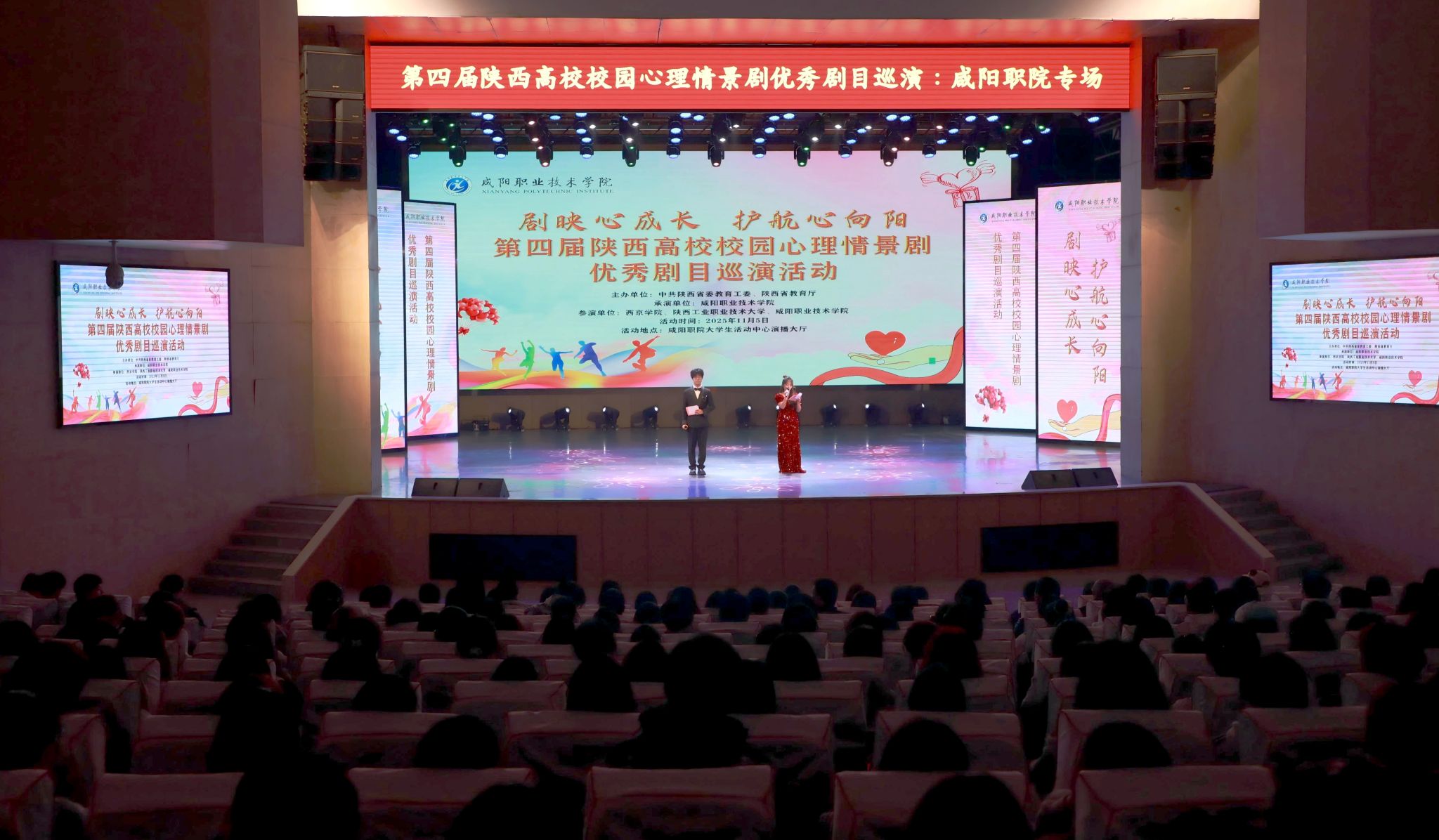 beat365英国官方网站副院长吴旭锦、学生处负责人,陕西中医药大学、西京学院、陕西国际商贸学院、陕西服装工程学院、陕西工业职业技术大学、陕西能源职业技术学院等兄弟院校的师生代表,以及各二级学院学发办主任、心理辅导员、2025 级学生代表等500余人观看,一起分享这场心灵与艺术的盛宴。