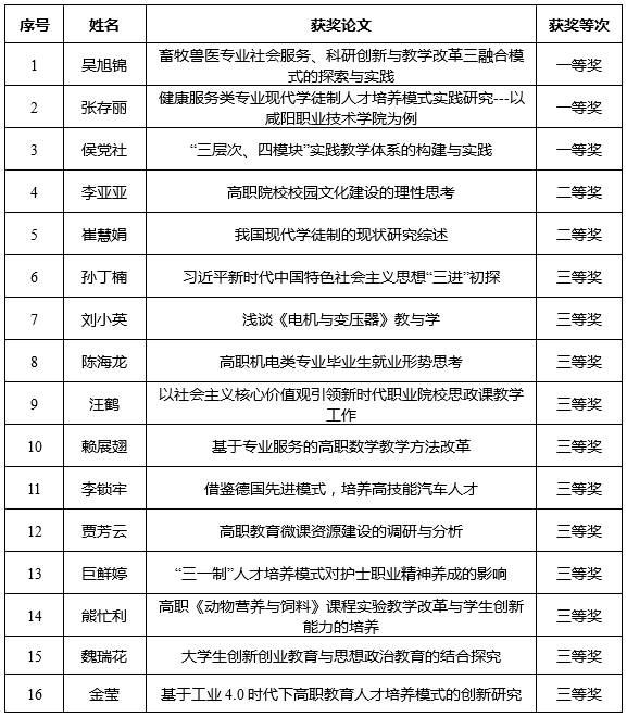 近日,从陕西省职业技术教育学会《关于公布学会2018年度优秀职教论文评选结果的通知》(陕职学〔2018〕67号)获知,我院选送的16篇论文获奖,其中一等奖3篇,二等奖2篇,三等奖11篇,同时我院被评为2018年度优秀职教论文评选工作优秀组织奖。