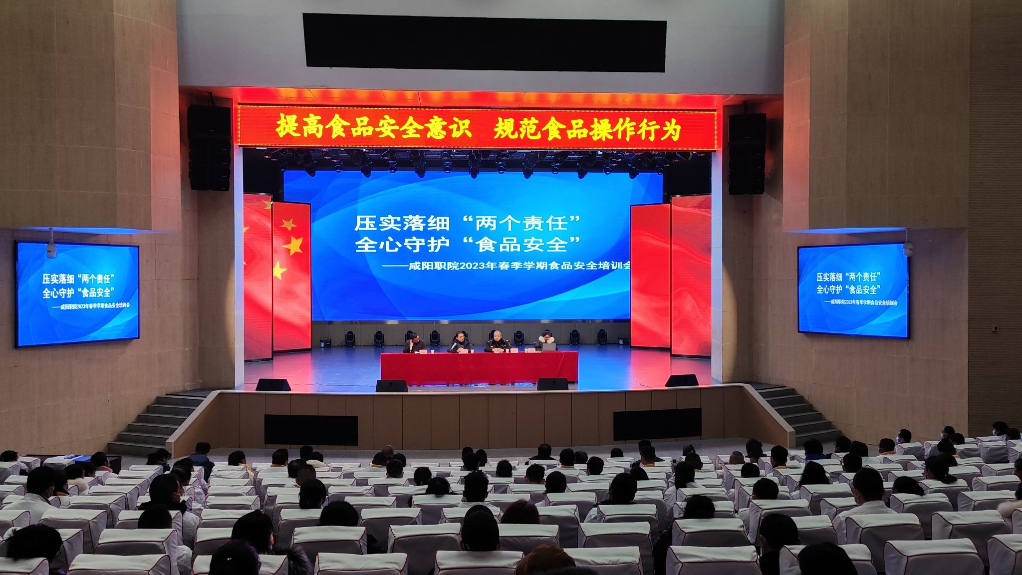 为有序推进学院2023年春季学期食品安全工作,全力保障学院2万余名师生“舌尖上的安全”,2月16日,beat365英国官方网站后勤处召开食品安全培训会,邀请沣西新城市场监督管理局钓台所食品安全主管郭跃同志作专题培训。学生食堂管理人员、炊事人员近400人参加培训。