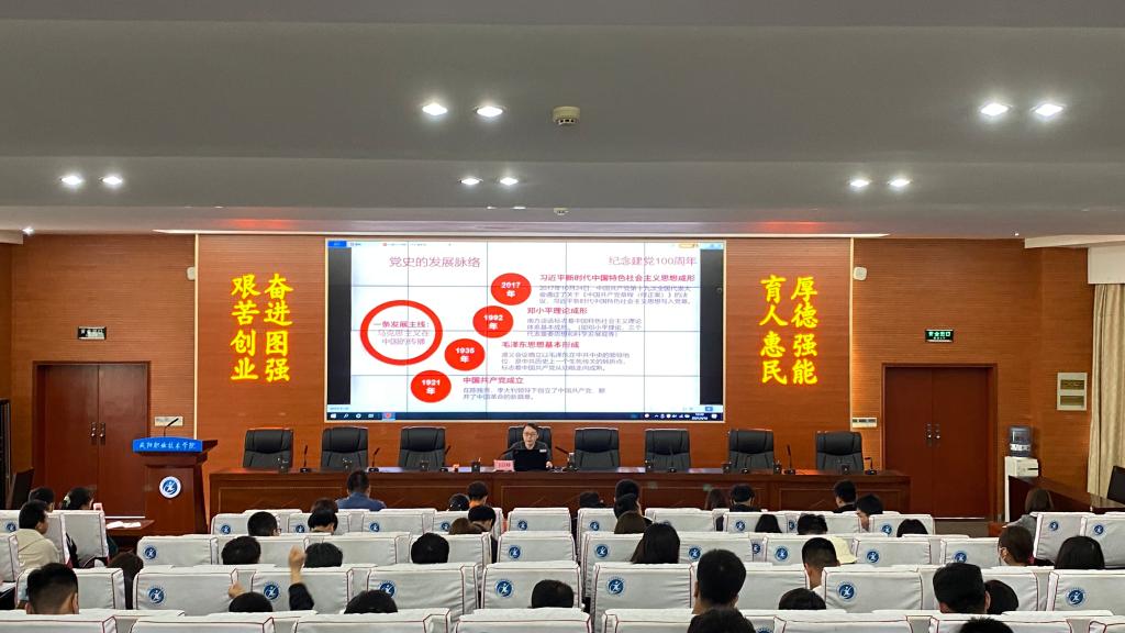 王江峰副教授从明理、增信、崇德、力行等四方面讲解了学习中国共产党党史的意义和目的,以中国共产党第一次至第十九次全国代表大会为主线,从新民主主义革命、社会主义革命、改革开放新的伟大革命讲述了中国共产党一百年辉煌历史的基本脉络,清晰阐述了中共党史、新中国史、改革开放史和社会主义发展史的逻辑关系。用百年历史事实告诉学生,只有中国共产党才能救中国、领导中国;只有社会主义才能救中国;只有中国特色社会主义才能强大中国。要求广大学生要从中国共产党一百年辉煌历史中寻找坚定理想信念的直接动力,跑好实现“两个一百年”奋斗目标和中华民族伟大复兴的“中国梦”的接力赛。