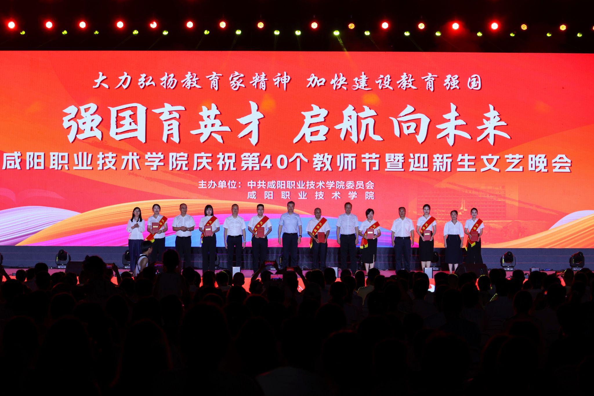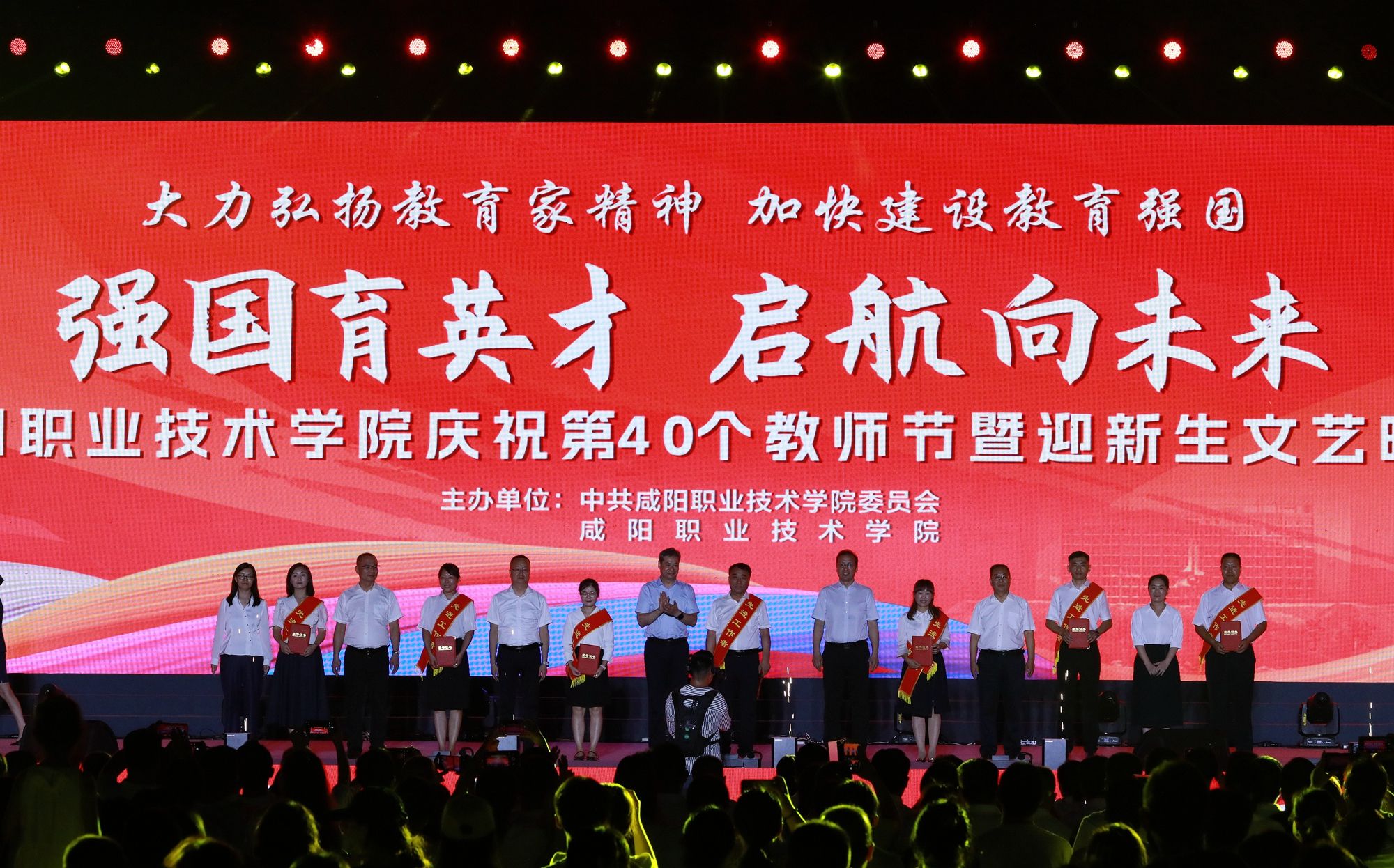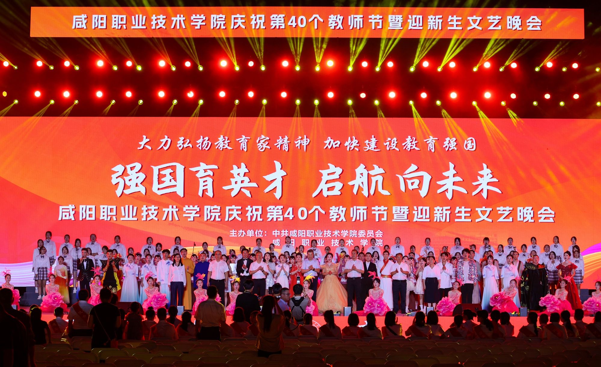 遍地蕙兰化思雨,满园桃李谢春风。为大力弘扬教育家精神,加快建设教育强国,向全体教师致以真挚的节日问候。9月8日晚,beat365英国官方网站“强国育英才·启航向未来”庆祝第40个教师节暨2024年迎新生文艺晚会在学院第二田径场举行。学院党委书记张迪,院长杨卫军,党委副书记、工会主席孙彦彬,党委副书记赵维,副院长杨新宇、吴旭锦,纪委书记王宇文,各二级学院、处室党政负责人、教师代表及全体新生欢聚一堂,共同庆祝第40个教师节。