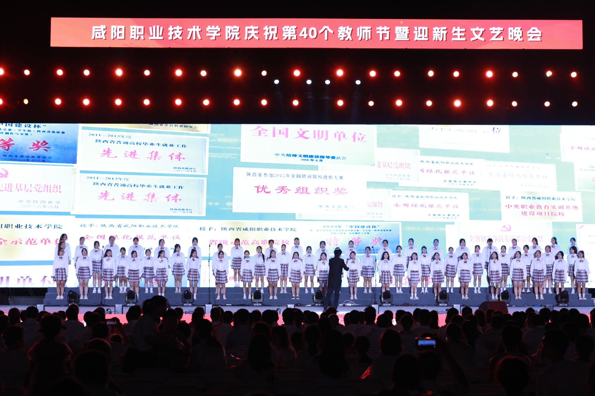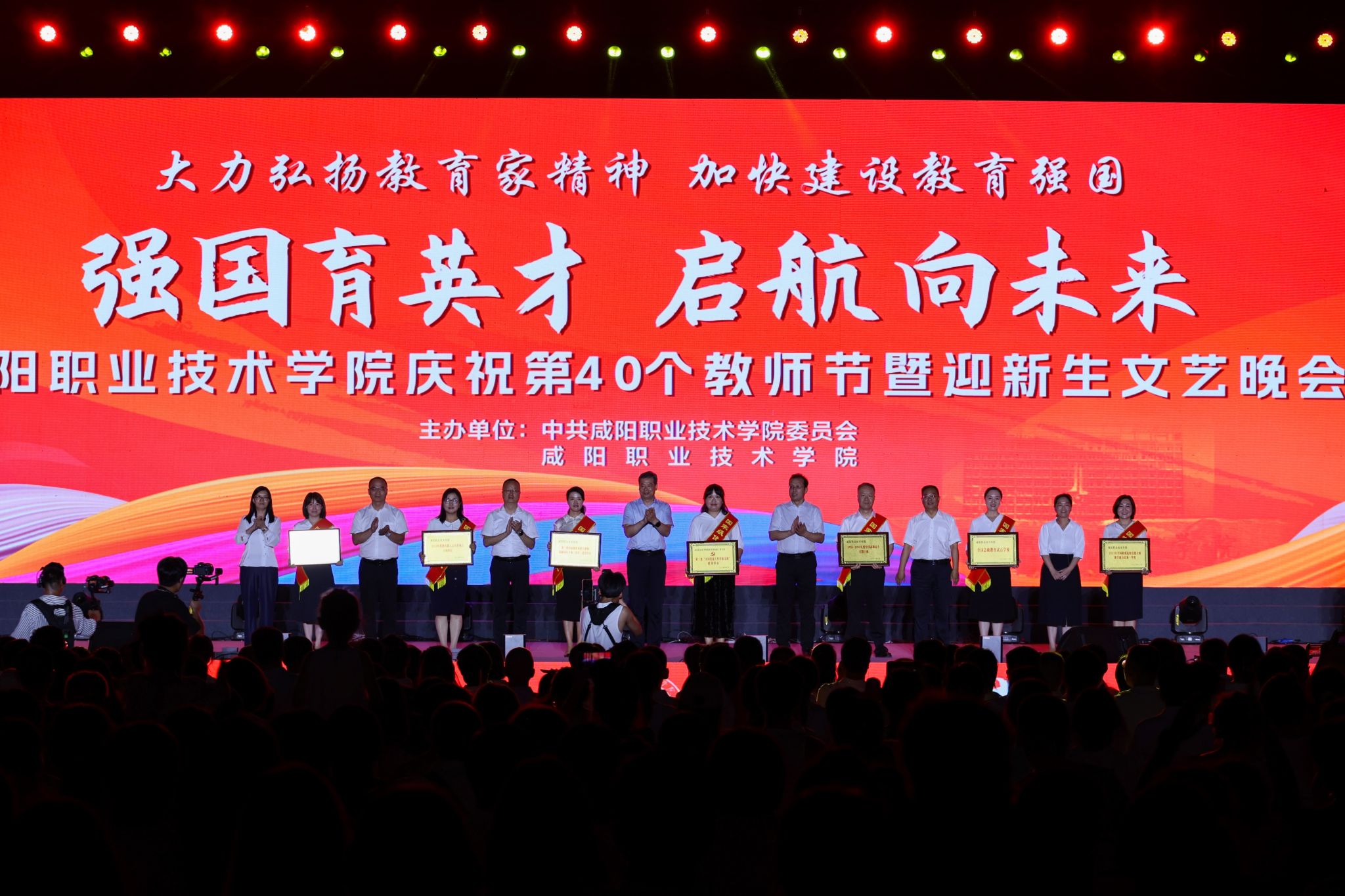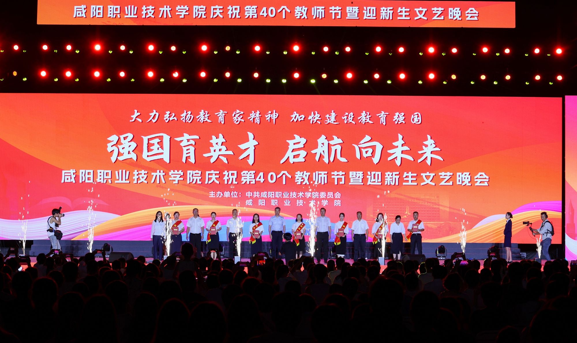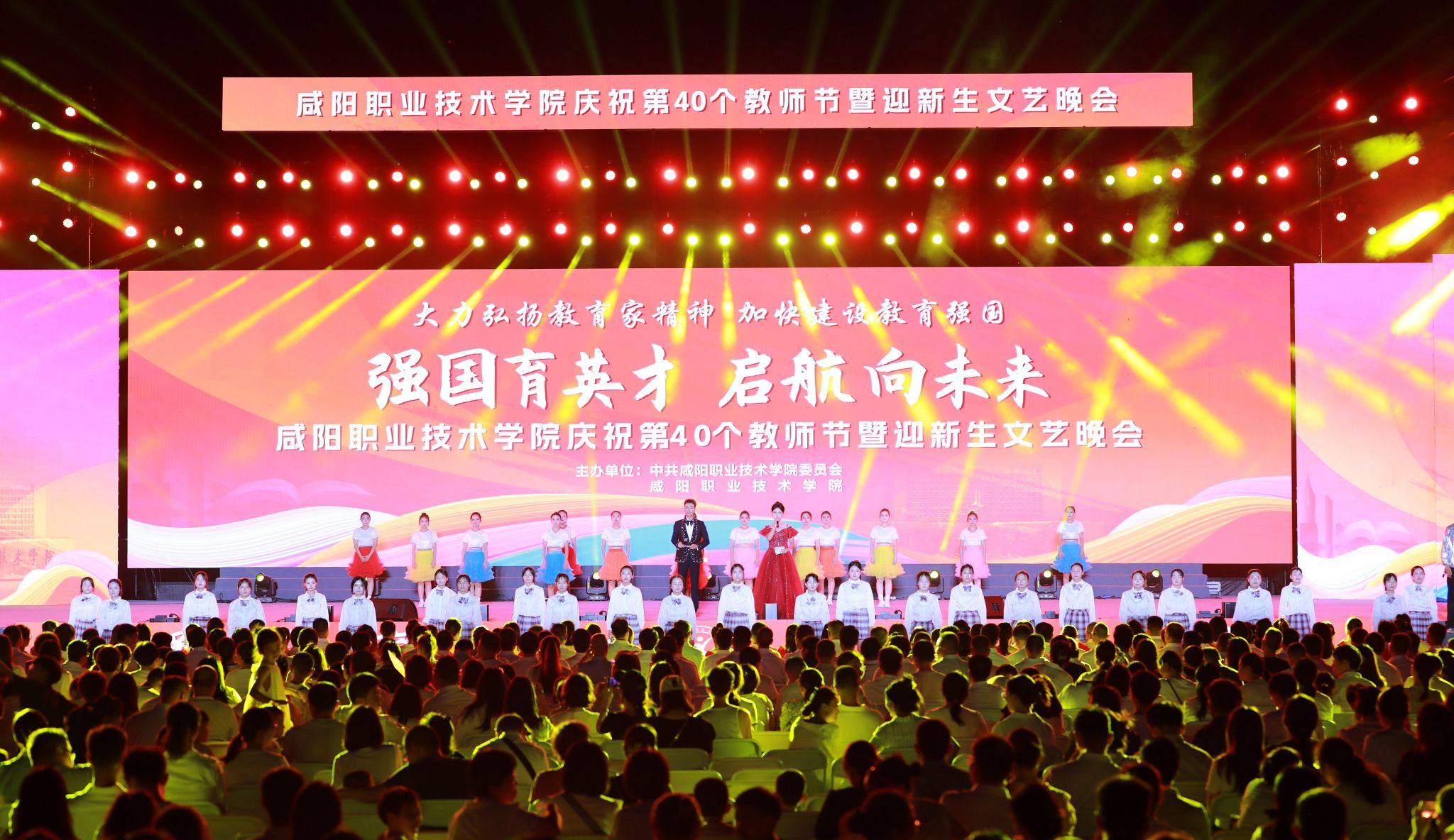 遍地蕙兰化思雨,满园桃李谢春风。为大力弘扬教育家精神,加快建设教育强国,向全体教师致以真挚的节日问候。9月8日晚,beat365英国官方网站“强国育英才·启航向未来”庆祝第40个教师节暨2024年迎新生文艺晚会在学院第二田径场举行。学院党委书记张迪,院长杨卫军,党委副书记、工会主席孙彦彬,党委副书记赵维,副院长杨新宇、吴旭锦,纪委书记王宇文,各二级学院、处室党政负责人、教师代表及全体新生欢聚一堂,共同庆祝第40个教师节。